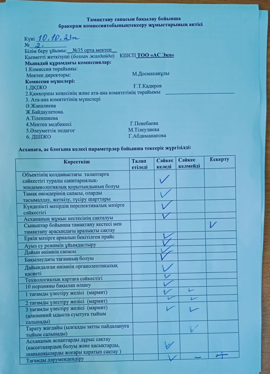 Тамақтану сапасын бақылау бойынша бракераж комиссия тобының тексеру жұмысының актісі » СШ №35