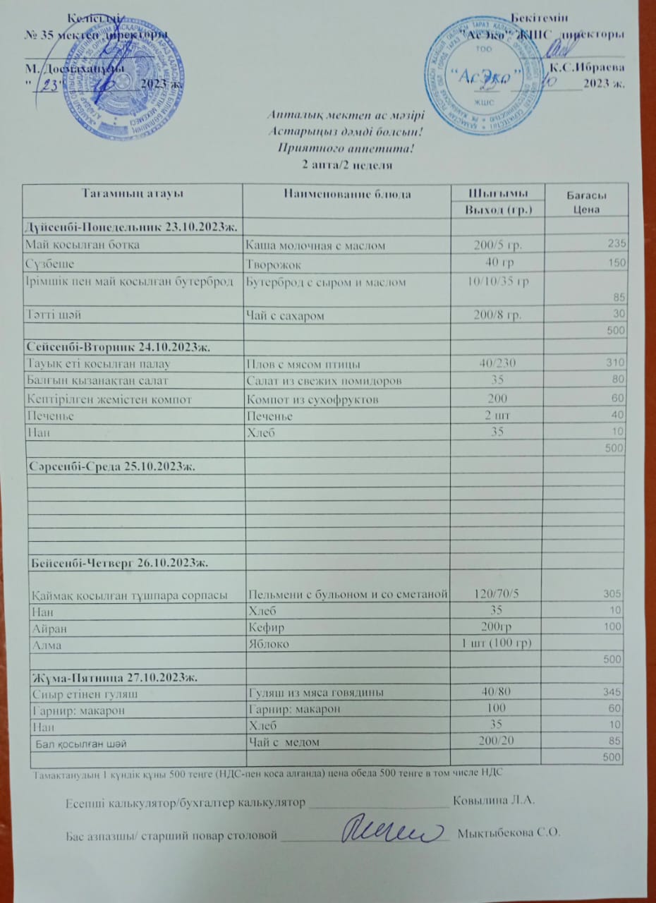 Меню на неделю, Ас мәзірі апталық » СШ №35