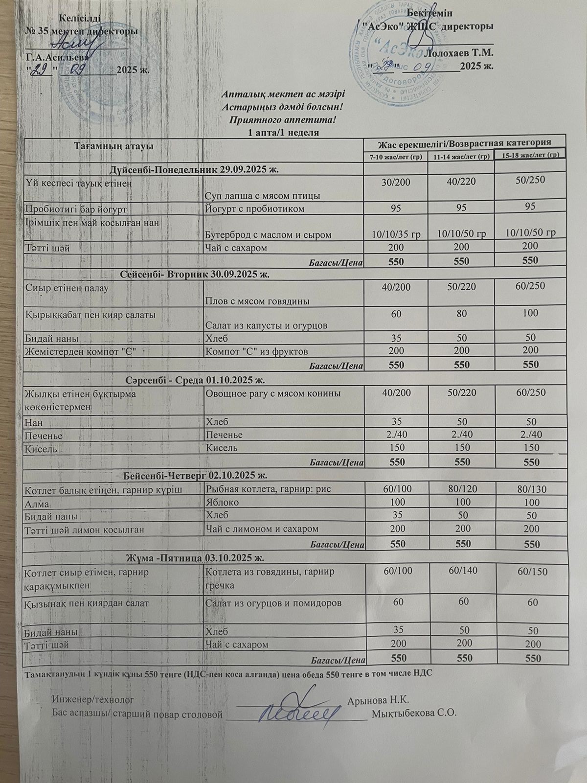 22 апрель 2025 ас мәзірі/меню
