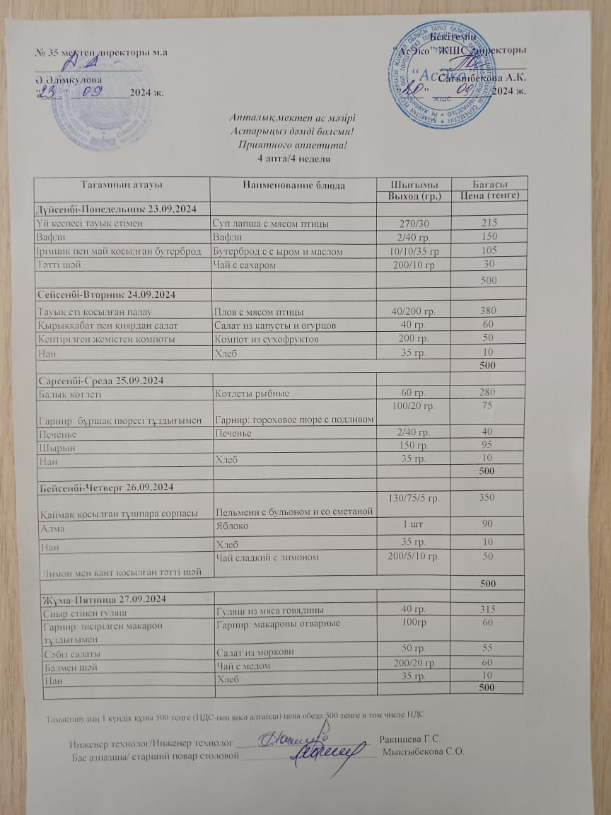Апталық Ас мәзірі Меню на неделью » СШ №35